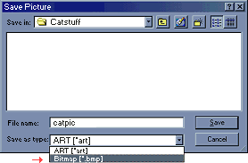 Abycat sent this suggestion if you don't want to turn compression off: "Another way is to watch the file you save it as. When the "Save Picture" dialogue pops up, where it says "Save as type", click, and choose "Bitmap [*.bmp]". That way you can edit and use the image. If you want to post it on the Web, of course, it must be converted to .gif or .jpg. Hope this helps! I attached a picture of how I do it." [Remember: If you have compression turned on, don't save images directly as .gif or .jpg - save them as .bmp, then convert to .gif or .jpg.]
