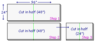 Go to your local lumber store to purchase white melamine-covered particle board shelves of the needed size. This example starts out with two 96" long boards, but four 48" long boards would work just as well and require only one cut. We chose melamine-covered because it is easily cleaned and looks sanitary. However, regular pine or particle board would work fine and cost less, though you would want to paint the finished room as a final step so it isn't porous. Ask the clerk to cut two 96" boards in half; set aside three of the pieces. Then have him cut the fourth piece in half again. The six pieces will (hopefully) fit in the back seat or trunk of your car. Don't forget to pick up a box of particle-board screws (you'll need 12-18, depending on how sturdy you want it to be). |
