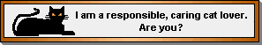 The "I Can't Keep this Cat Because ..." QuizBelow is a list of reasons people have given as to why they no longer want their cat. Choose a reply as a responsible and caring cat owner. Select the correct answers by using the drop down menus. When you are finished, click Submit. Your score will appear at the bottom; incorrect responses will be checkmarked. You must be using a javascript-enabled browser for the scoring to work. Seventy thousand (70,000!!) kittens and puppies are born every day just in the United States. These unwanted kittens are tossed out the door, and join feral colonies, scrounging for food each and every day. They suffer from hunger and/or disease, become an annoyance in the neighborhood, and either continue to add to the population, or are killed. Spaying/neutering your pet ensures it will have a longer, healthier life. It prevents unwanted litters, needless suffering, and an increase in taxes to pay animal shelter costs. Most cats enjoy being brushed, and will soon come running as soon as they see the brush in your hand. Daily or frequent brushing will greatly minimize the amount of loose fur settling in the corners of your house, and will also prevent a lot of hair balls being coughed up. Train your cat to use a scratching post. It should be sturdy and tall enough to let the cat stretch to his full height. If he still persists in scratching the furniture, try placing a few balloons or pieces of aluminum foil around the area. The noise of a bursting balloon or crackling foil should frighten him off without hurting him. Many times you can simply "redirect" him to the scratching post, and he will eventually get the idea. Persistent spraying occurs in unneutered males as a form of territory marking. But some unspayed females spray also. Neutering should stop the spraying habit in most cats -- especially if done while the cat is still young. Note that in some cases, a cat who has been neutered and hasn't sprayed, may start doing so when it is very stressed, such as when you bring a new person or animal into the house. If that happens, lavish a great deal of affection on the cat and try to eliminate the stress factor. Medication for the treatment of worms is easily and inexpensively obtained from your vet. If your cat is constantly shaking his head or scratching at his ears, he has ear mites. Treatment options from your vet for ear mites may include: medicine which you put in his ear; one or two shots of medication; or using an ear dropper to put a few drops of slightly warmed mineral oil in his ear; or (new) a vial of liquid that you break open and put on the kitty's skin between his shoulders. Many superstitions still abound about cats. Here are some more. All kittens are playful, but will calm down in a few months. Give her "approved toys" such as a kitty tree, so she can exercise. And since the draperies are already shredded, you can replace them with horizontal blinds, so kitty can go through them to sit on the windowsill. Your cat thinks you are simply another cat (a rather large one. For that reason, she wants to sleep where you are, to cement the bond. If you really don't want kitty to sleep in your bed, keep the bedroom door closed. Cats are generally very tolerant of children, and will defend themselves only if they are being hurt. Don't let your youngster pull your kitty's tail or ears, and show him the proper way to carry the kitty. Instill in your child a respect for all lifeforms; studies have shown that serial killers started out abusing animals. The cost of owning a pet is considerably less than that of raising a child, but it is, nonetheless, a responsibility. You are literally responsible for another life. Spay or neuter your pet, and have your pet vaccinated against disease. Give your cat the most healthy food (no, it doesn't have to be the most expensive), and the care of a good veterinarian (yes, do shop around - quality care is not ensured just because he's a vet, and be aware that all fees are not the same at all offices). To keep your cat off the kitchen counter, stack a few baking pans or other noise-making devices along the edge of the counter so that they fall down when the cat jumps up. In many cases, though, you can simply pick the cat up off the counter, say "No!" firmly, and drop him (firmly but not sufficient to hurt) onto the floor. Get in the habit of hitting the hood of your car a couple times before starting the engine, just in case a "neighbor's" cat is sleeping under the hood. You can purchase a small bottle of a substance that can be sprayed onto your Christmas tree that will persuade him to stay far away. The spray can also be useful for keeping him off of furniture; be sure to follow the directions and don't spray directly on that beloved Victorian antique, however. If your existing cat displays animosity toward your new one, it is probably feeling jealous. A very workable solution is for you to sit down, with a cat on each side, and pet them both at the same time. This will let your existing kitty know he's not being replaced in your affection, as well as subtly inform the new kitten that his new sister/brother is his equal in your eyes. If your cat pushes out too much kitty litter, the litter pan may be too small, or the sides may not be high enough. Numerous shapes and sizes of litter pans are available, including those with high sides and a lip, or completely enclosed. If your cat craves attention while you're sitting quietly, why not go ahead and indulge him by letting him sit next to you on the sofa, and petting him softly? If he persists in bothering you, you might want to ask yourself if you've remembered to feed him. Cats spend at least 18 hours out of every 24 sleeping, and will sleep even more if they're bored. Spend some time daily with your cat, letting it chase a feather or string. [Aside: You might want to invest in several toys and keep them in a basket - though your cat won't put them back in the basket, you may be