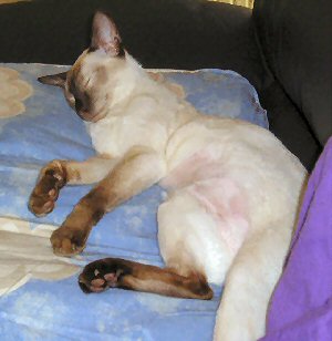 ![]() SinJin Sha Kaya, an Australian Champion seal point Siamese shortly after she was spayed. Sent in by companion Paul. "Be nice I just got out of hospital!" |