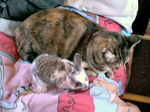 ![]() From Patricia: Tigger and Smokey. Just before the photo, the cat was giving the rabbit a bath. (Hey, fur's fur!) |