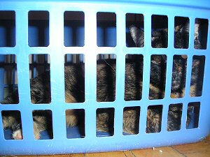 ![]() Tiggee really wanted to sleep in the basket - even if it was on its side! Sent in by companion Atheana |