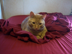 ![]() Seems as though Tigger likes to play on the bed while Mom Tina changes the sheets. One day Tigger was covered up with sheets and blankets for several hours. Mom Tina found him under the blankets doing what cats do - sleeping. He also likes to pose for the camera. The photo was edited for contrast and color. Tigger, sent in by companion Ken |