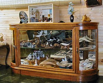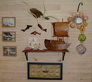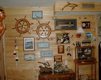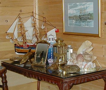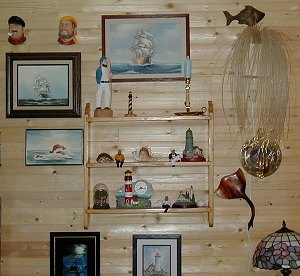 scrimshaw carving, and some mini lighthouse figures. The ship's lantern