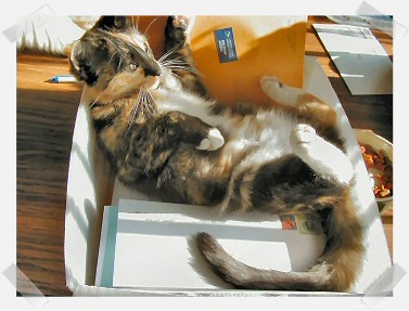![]() Sophie in a box with the mail that's waiting to be taken to the Post Office. |