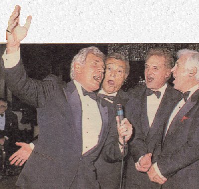 Gene Barry, Tony Martin?, Robert Stack, and Jack Jones serenading Betty Barry